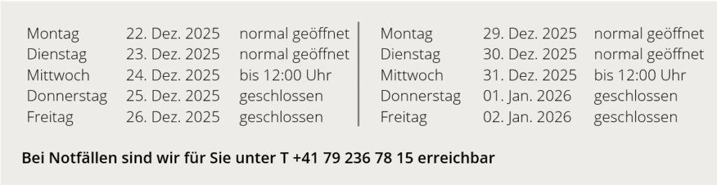 Ab Montag, 5. Januar 2026 sind wir wieder zu den gewohnten Öffnungszeiten für Sie da.